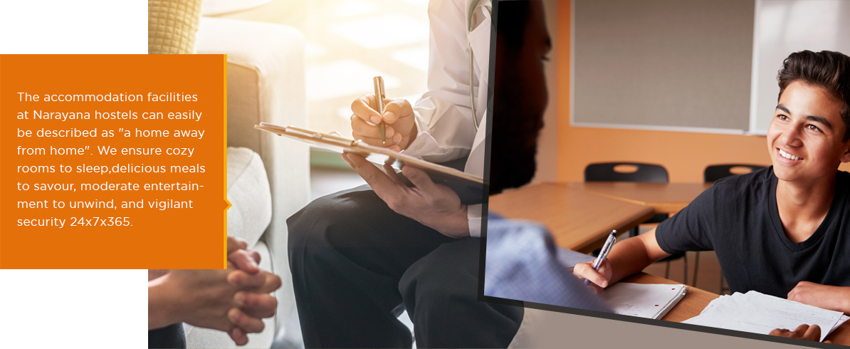 The accommodation facilities at Narayana hostels can easily be described as "a home away from home". We ensure cozy rooms to sleep, delicious meals to savour, moderate entertainment to unwind, and vigilant security 24x7x365.